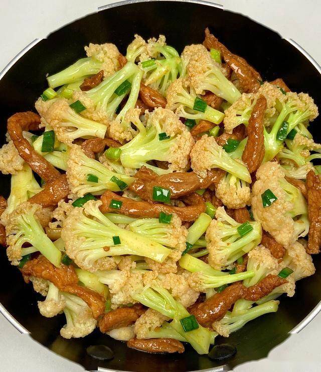 4、加入焯好的花菜,加少许盐调味,快速翻炒均匀,让花菜充分裹上肉香,最后撒上葱花即可出锅。