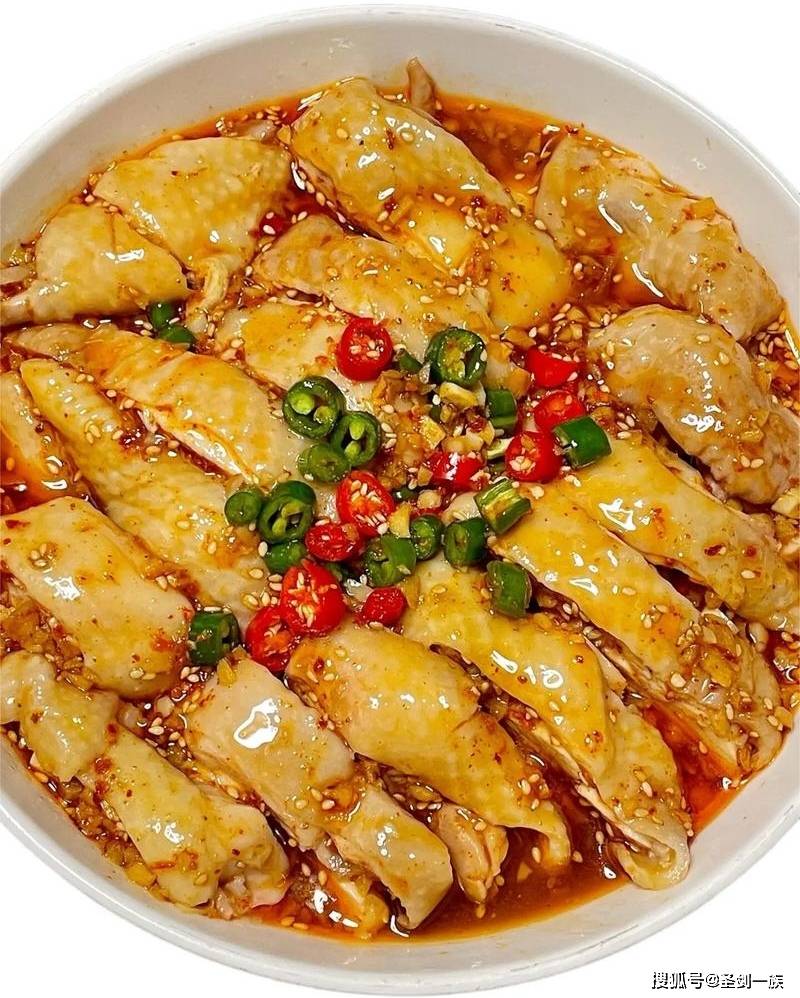 5. 将酱料均匀淋在鸡肉上,撒熟芝麻与花生碎,红绿相间,香气四溢。