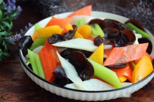 【五彩小炒】所需材料:山药半根、芹菜1棵、黄椒半个、水发木耳半碗、油盐适量、姜2片、大蒜3瓣、鸡精1茶匙、水淀粉适量