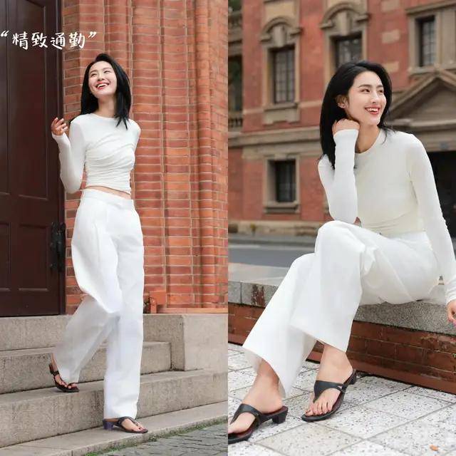 虽然上面这一条白色的西装裤和白色的针织上衣组合搭配,确实精致又通勤时髦,但对于面料和版型的要求极高,面料一定要挺阔有型,不容易起褶皱,穿在身上才显干练。
