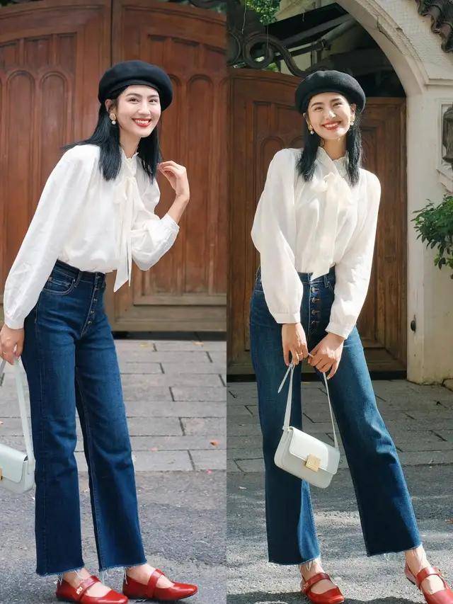 当我们上衣换成一件小众的白色衬衫,这时候可以选择经典的蓝色牛仔直筒九分裤来组合,脚踩一双红色的玛丽珍鞋,这样打扮简约大气,复古洋气,头戴一顶黑色的贝雷帽,让整体打扮显得更加俏皮。