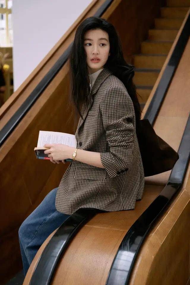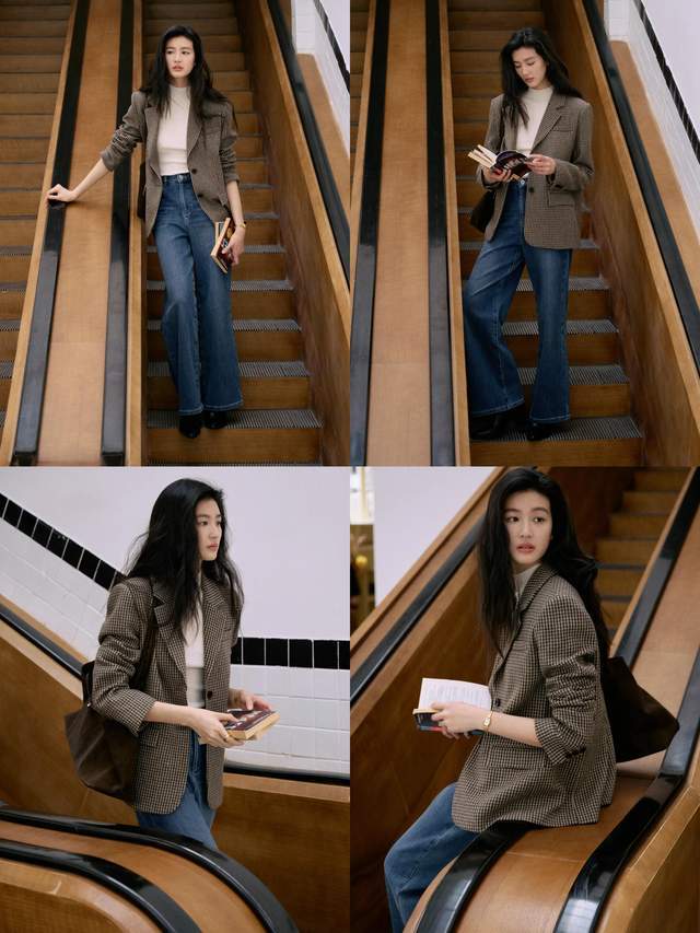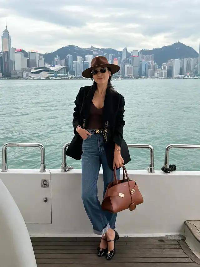 还不如自己选择一件黑色的西装外套,内搭棕色的打底衫和一条蓝色的牛仔直筒九分裤,脚踩一双黑色的低跟单鞋,玛丽珍鞋,头戴棕色的宽檐帽,这样反而更有氛围感,呈现出一种轻熟风的气质。