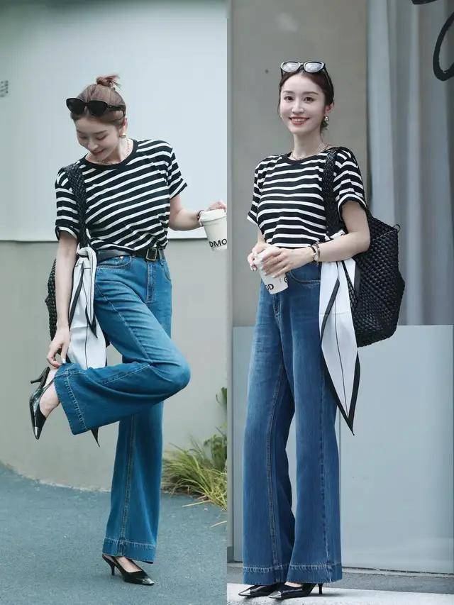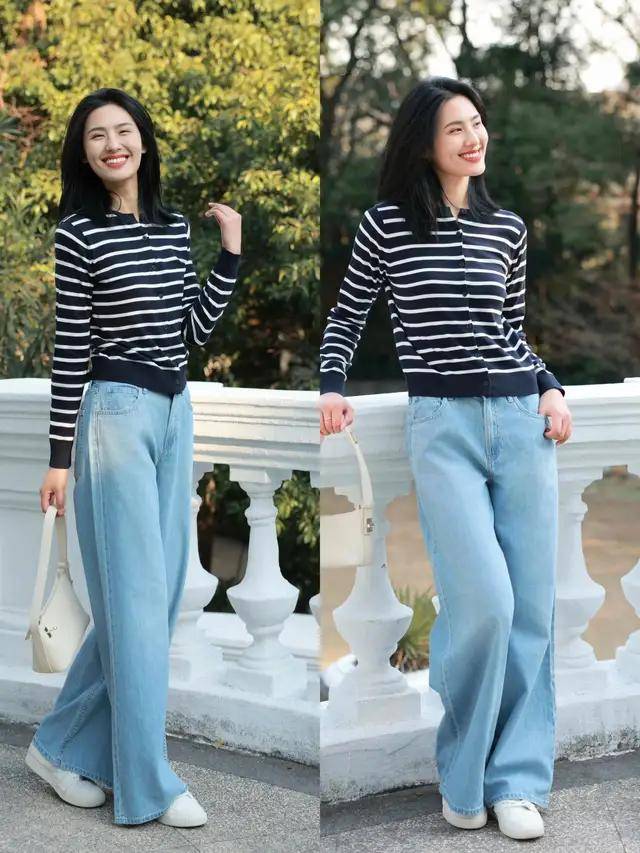 我们还可以选择黑白条纹针织开衫,搭配上牛仔直筒阔腿裤,脚上踩着一双小白鞋,这样的打扮属于反简洁和搭配,能打破穿衣造型单一问题,而且经典来看穿去上班、逛街约会或者是出门旅游拍照都很出片。