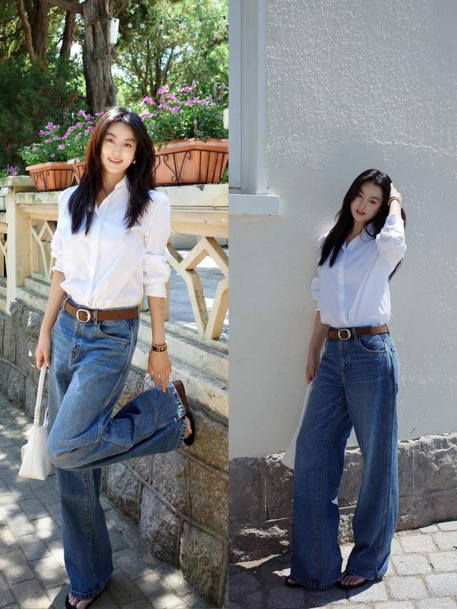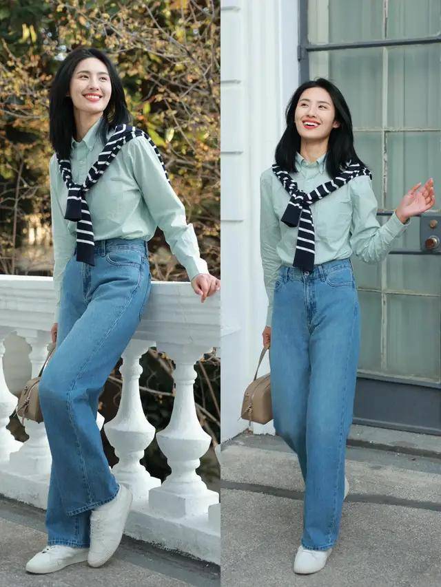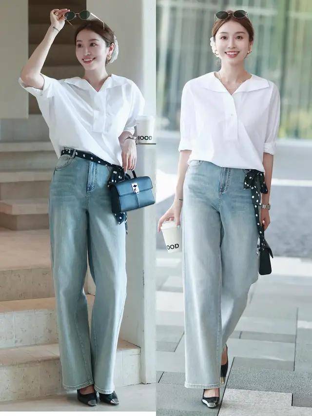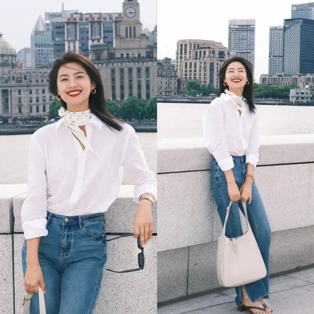 不过相信再过个 10 天半个月,天气应该都基本上回暖,这时候我们就可以选择一件小众的白色翻领衬衫搭配上牛仔直筒裤,裤脚尽量不要过长,正好在脚踝的位置最佳,穿在身上才不容易压个子。