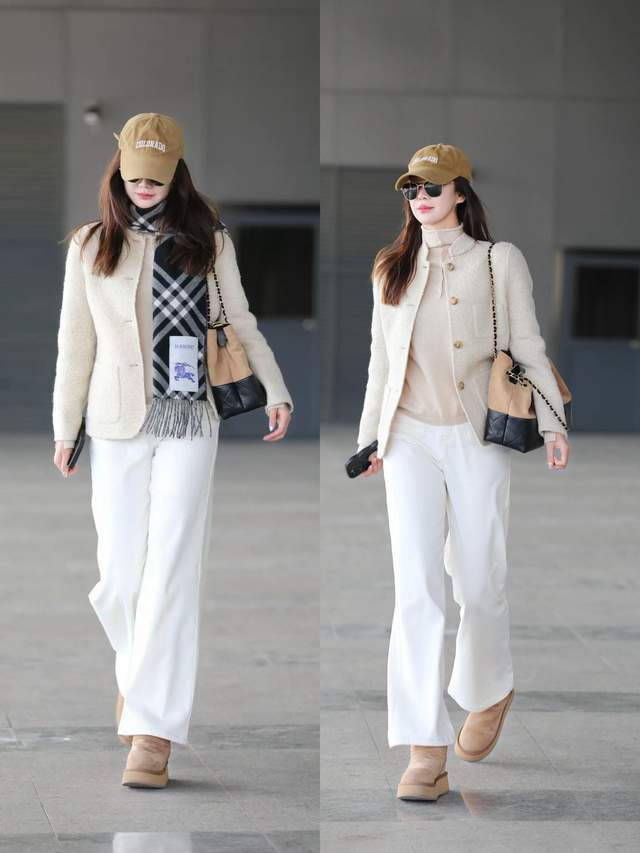 一件短款的小香风外套,内搭杏色的针织打底衫,还有一条白色的直筒牛仔裤。这样的打扮就能使得身材变成三七分比例。