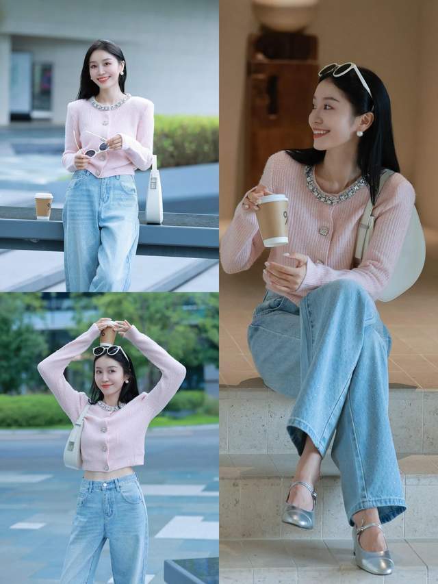 当然你也可以选择短款的针织粉色上衣搭配一条蓝色的牛仔裤,脚上踩着一双粗跟的银色玛丽珍鞋。这样的打扮出去旅游拍照真的太出片了。同样适当添加一些配饰,比如说一对比较精致的珍珠耳环,或者是比较个性的墨镜,能增加造型的精致感。
