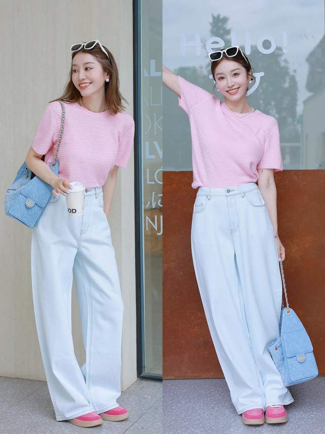 当我们下半身是一条浅蓝色的牛仔裤,已经接近白色了,这时候我们可以用粉色的针织短袖来组合,能够使得穿搭者看起来更显年轻,少女感扑面而来,活力感拉满。