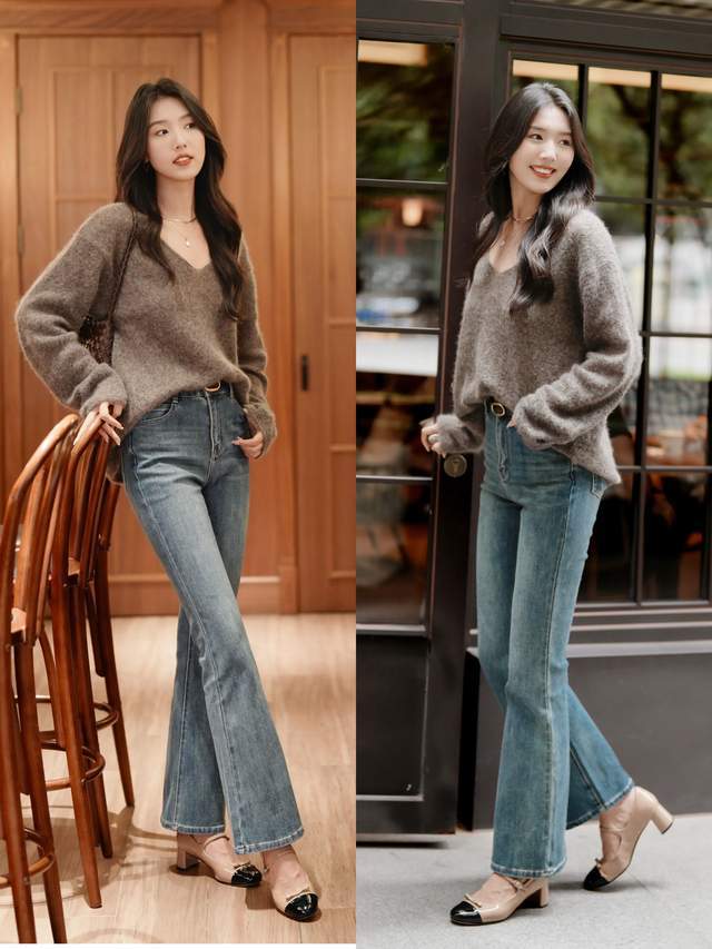 想让自己的打扮比较温柔得体的情况下,我们可以选择一件燕麦色的毛衣搭配上蓝色的牛仔直筒九分裤,脚上踩着一双粗跟的浅口拼接色单鞋,结合大波浪的卷发造型,既简约又温柔,得体大方。这样的穿搭真的很适合现在的春节。第四章节,鞋子篇