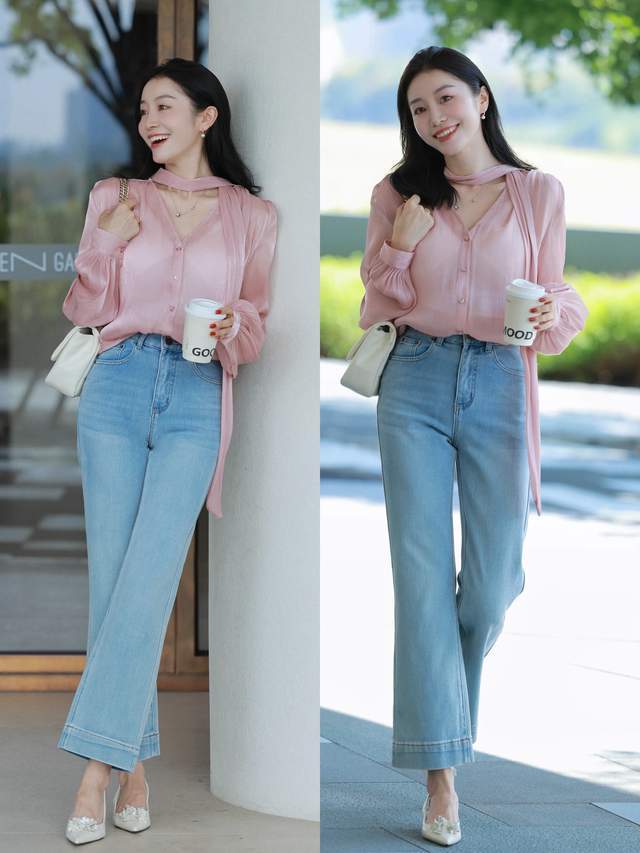 当然啦,也可以选择用一件浅粉色的衬衫搭配上蓝色的牛仔九分裤,脚上穿了一双浅口高跟单鞋。这样的穿衣打扮既干练又显年轻,相信没有哪个女生能拒绝得了这样的粉色上衣。
