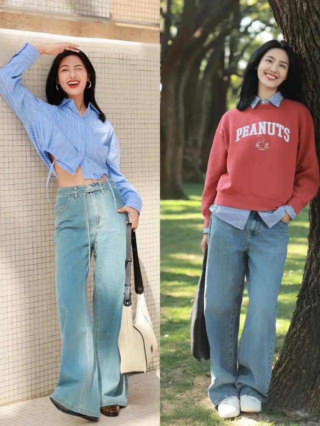 牛仔裤就好搭配得多,同时对于上衣的要求没有那么高,比较百搭。比如你用一件条纹衬衫搭配牛仔裤,或是红色卫衣叠穿蓝色衬衫和一条牛仔裤组合,这样的穿搭既休闲又时髦。