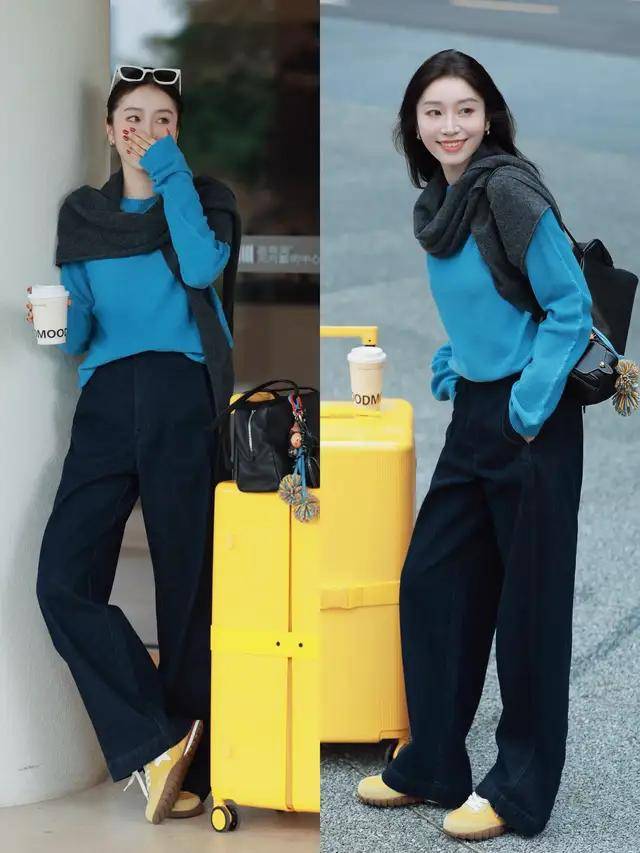 牛仔裤的色彩也有深浅之说,当你穿的是深色的牛仔直筒阔腿裤,我们可以用天空蓝的针织毛衣来组合,再用灰色的围巾来搭配,整体配色就找到了一个平衡点,这样的穿搭显得精致沉稳又大气。