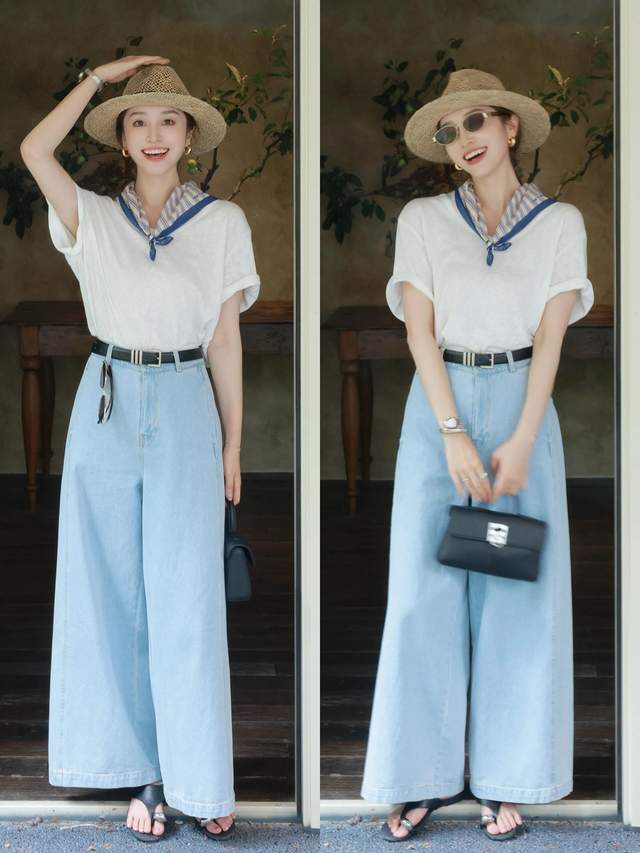 早春想要穿得时髦大气容易出错,那么我们要懂得做减法搭配。可以选择一件最为基础的白色 T 恤,加上一条蓝色的牛仔阔腿裤,穿的时候把上衣的衣角塞进裤子里面,勒上黑色的腰带,就能形成高腰线,再戴上一顶草帽,氛围感直接拉满。