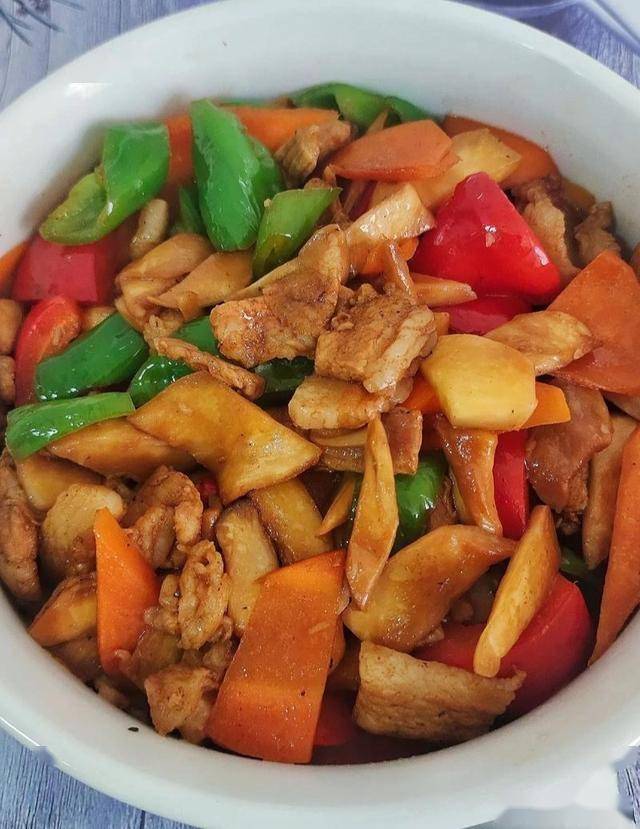 7. 倒入调好的酱汁,翻炒至酱汁浓稠均匀挂在肉丝上。