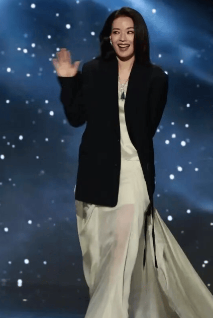 2026年《你我经历的一刻》:白衣拖地长裙配银色短靴,57岁仍纤瘦挺拔,被网友称为“仙女下凡”。
