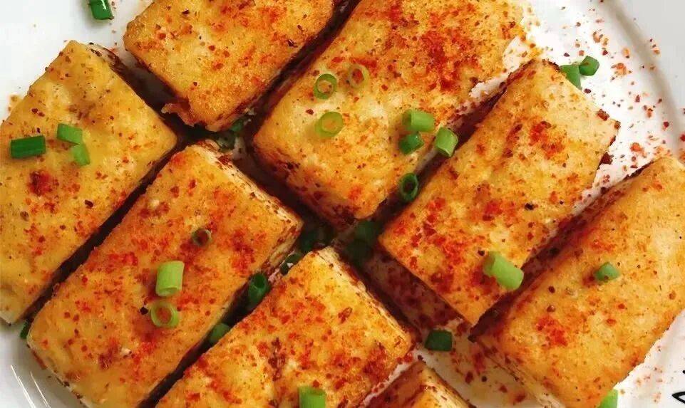 豆腐2块,酱油一点,烧烤料,孜然粉,辣椒粉,辣椒粉粉,葱花