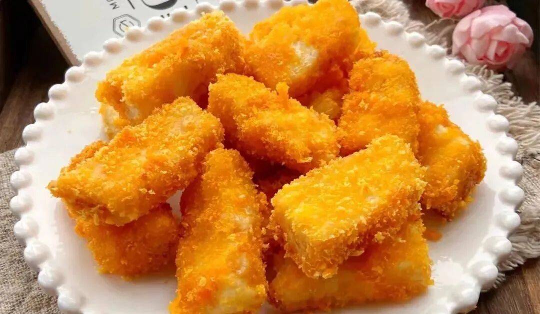 3奶条依次蘸淀粉,裹上鸡蛋液、蘸上面包糠,油温七成热(筷子冒泡)下锅炸至两面金黄~外酥里嫩的炸鲜奶就搞定啦~