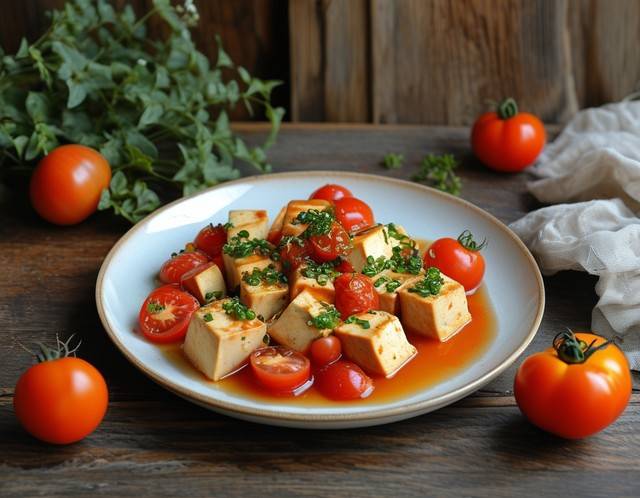 砂锅里咕嘟作响的番茄豆腐煲,是素菜中的暖心担当。老豆腐切厚块煎至两面金黄,与去皮番茄丁同炖。当番茄素熬出沙沙的质感,淋入水淀粉勾出浓稠红汤,最后撒上翠绿的葱花。红白绿三色交织,像极了雪地里绽放的寒梅。