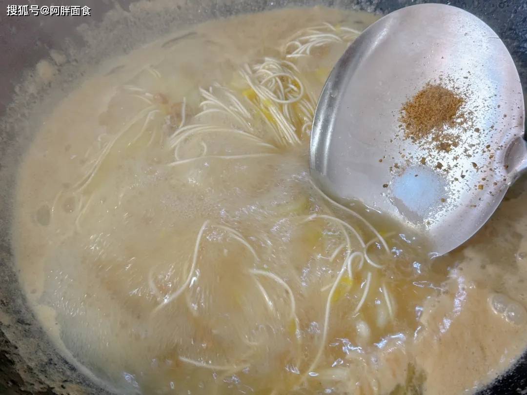 汤煮浓后,放入挂面,加盐调味,保持大火煮至面条五成熟。