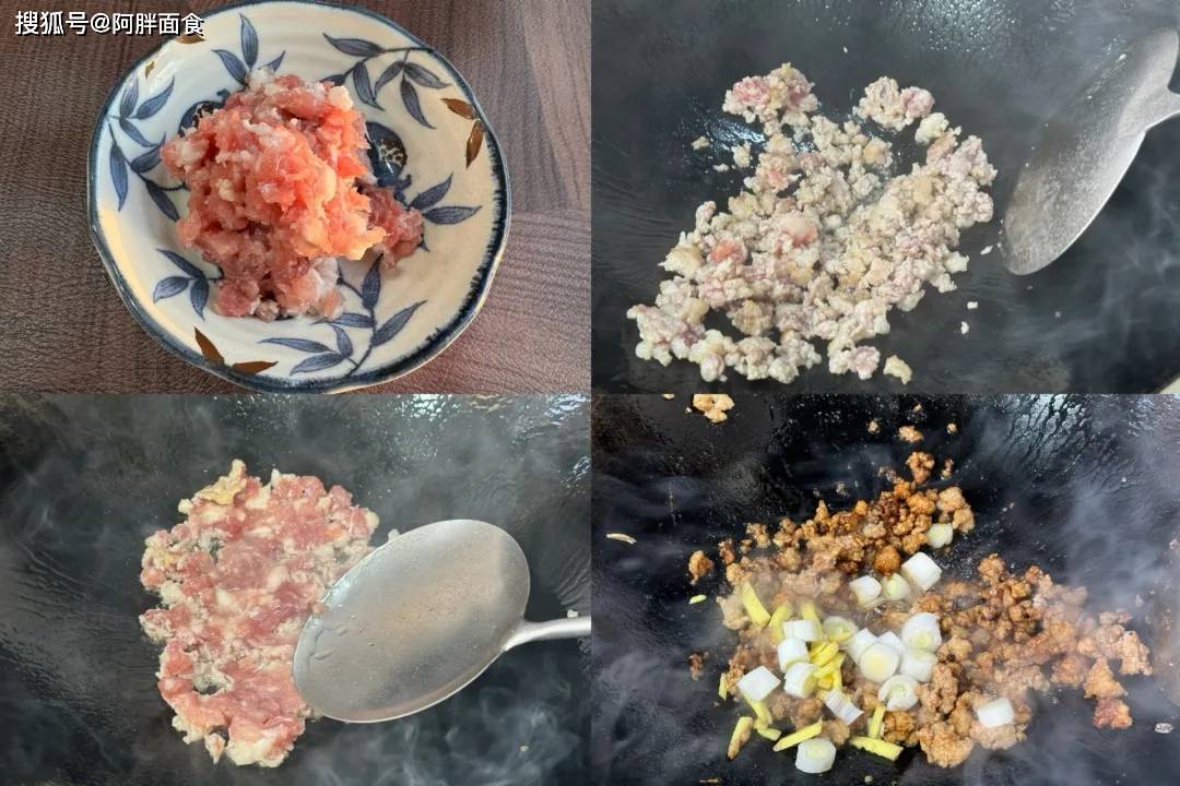 4、准备一些猪肉沫。锅里倒入食用油,并开大火。把油润开,之后放入肉沫,并用锅铲按压散开,这时先不要动肉沫,等待半分钟,底部定型了,再去翻炒,肉沫就不会粘锅了。肉沫炒变色,加入葱花,姜丝。再加点老抽,生抽,十三香,白胡椒粉去腥,全程开大火。
