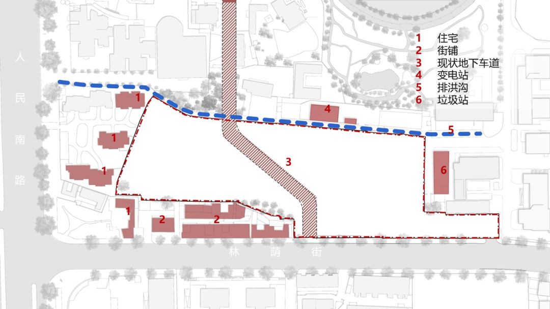 北侧的排洪沟渠,依稀能读出成都西北东南走向水网的遗存;西侧住宅与南侧街铺,则忠实记述着不同年代的多层建筑与构筑物,他们共同限定出用地曲折的边界。用地东侧,是校园内的动物楼以及垃圾站;而场地内部地面以下,还有着联通北侧田径场地下车库的一条地下车行连通道——它联通着为解决人民南路西侧华西医院停车困难而修建的地下停车场,在市民的日常生活中默默减缓日常交通的压力。所以这条穿越用地的地下车道需要拆除还建。如此种种,琐细而复杂。