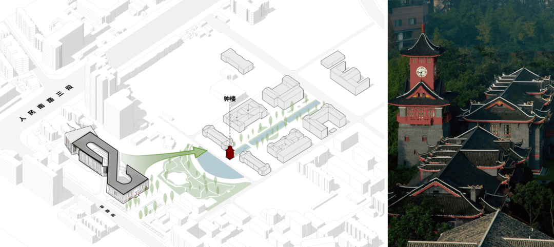 视觉通廊的建立:建筑东西轴线转折中部结合下沉广场做折线型凹入,串联校园南北干道,开辟指向钟楼的视觉通廊,强化科研日常与华西精神地标的联系。