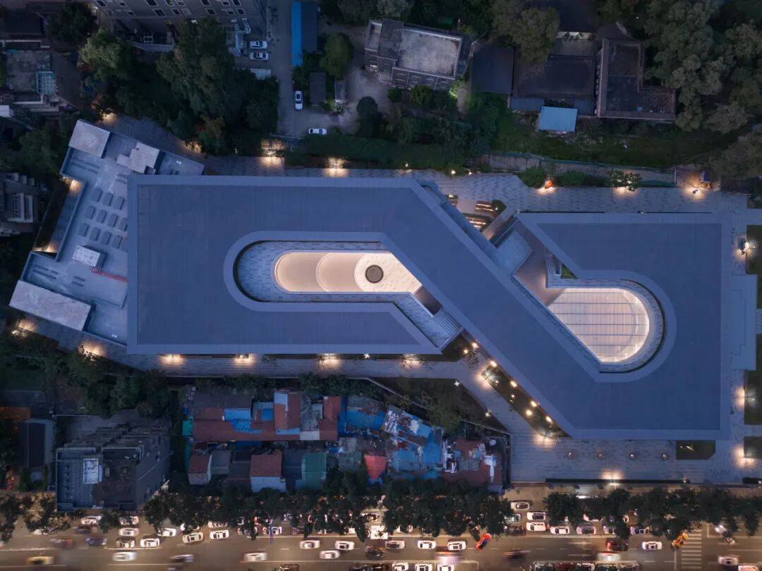 自屋顶鸟瞰,设计以正无穷大“∞”为理念,将建筑分为东西两个中庭,一虚一实。
