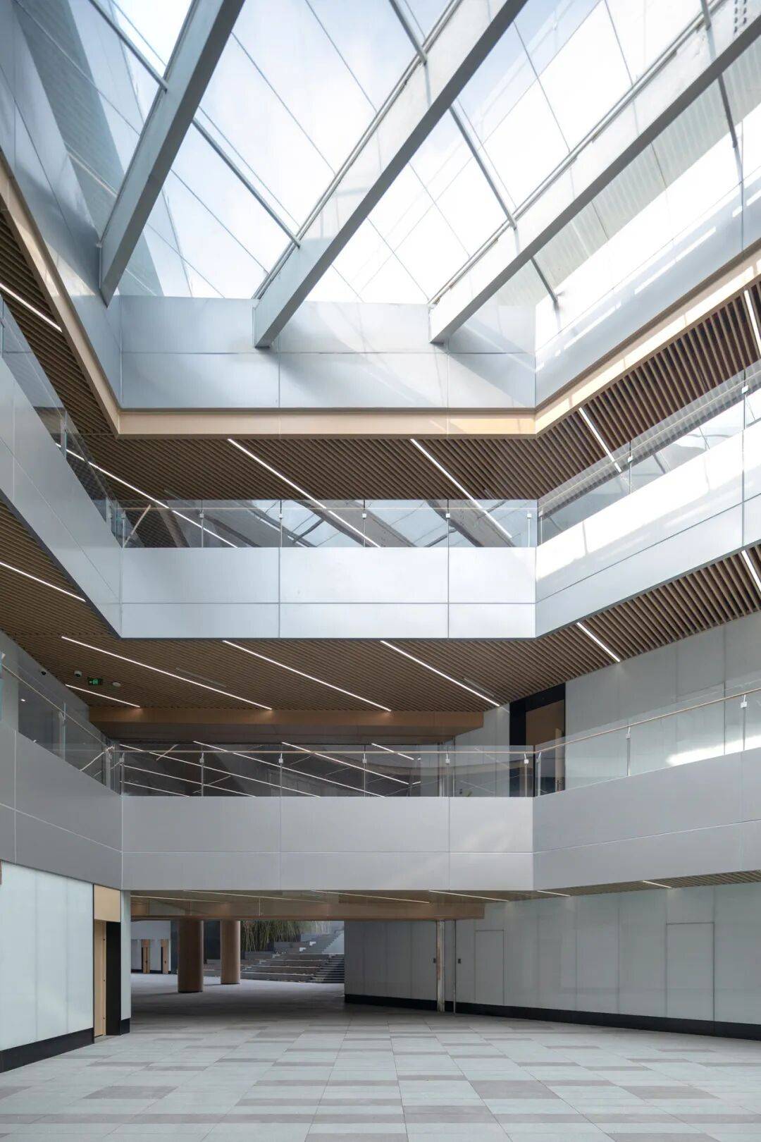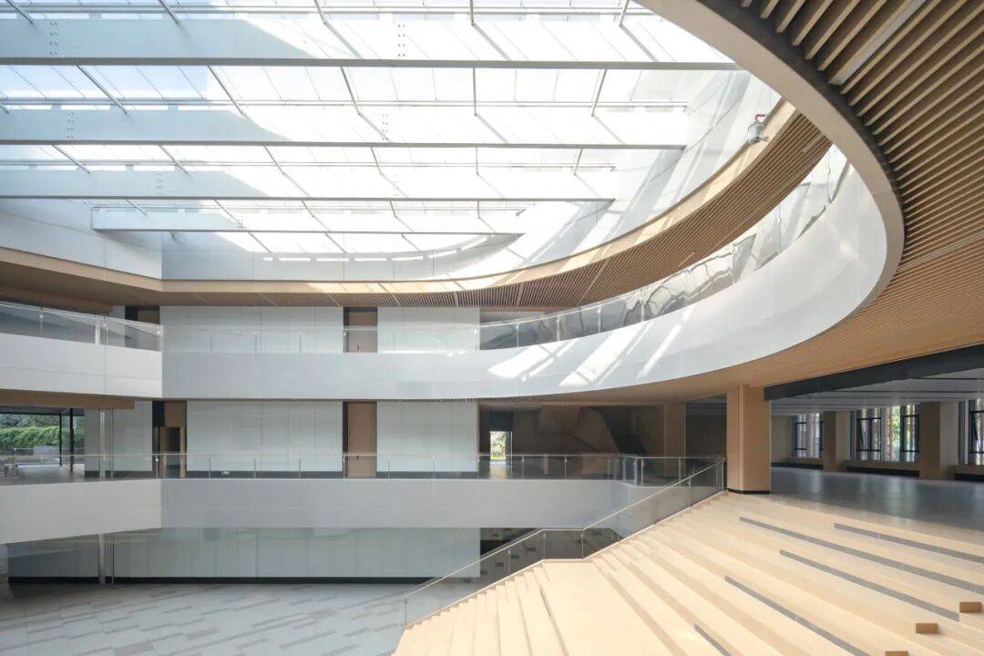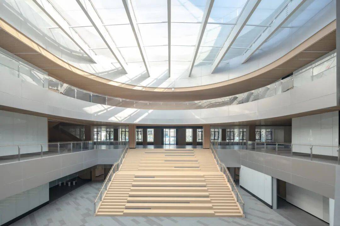 从校园南广场步入建筑,阳光自东中庭的玻璃采光顶直泻而下,温暖明亮,使负一层空间的地下感得到极大削弱;弧形大台阶的观演可能模糊了展览、沙龙与交通的功能界限。它创造出一处有顶盖的多功能公共空间;科学讲座、露天电影、新春音乐会都能够在此进行。