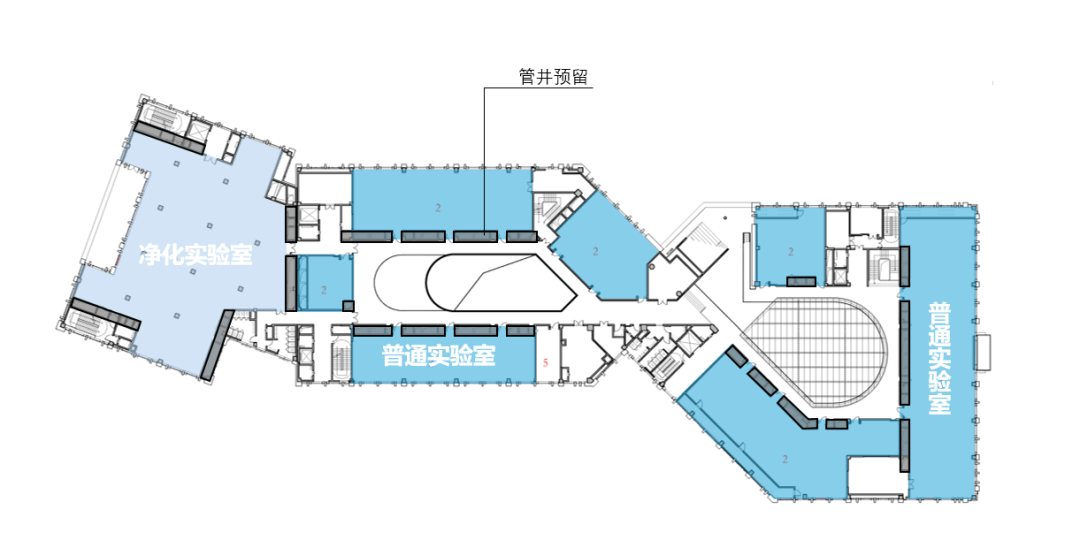 作为面向未来的通用性实验平台,项目的设计需充分考虑不同类别实验室的空间适配需求;以及很长一段时间内,不同实验室的进出及改造弹性。我们通过多方沟通、实地调研及前瞻研判,以通用布局、管井预留、设备空间包络等系列措施,实现定制与通用的平衡及可变。