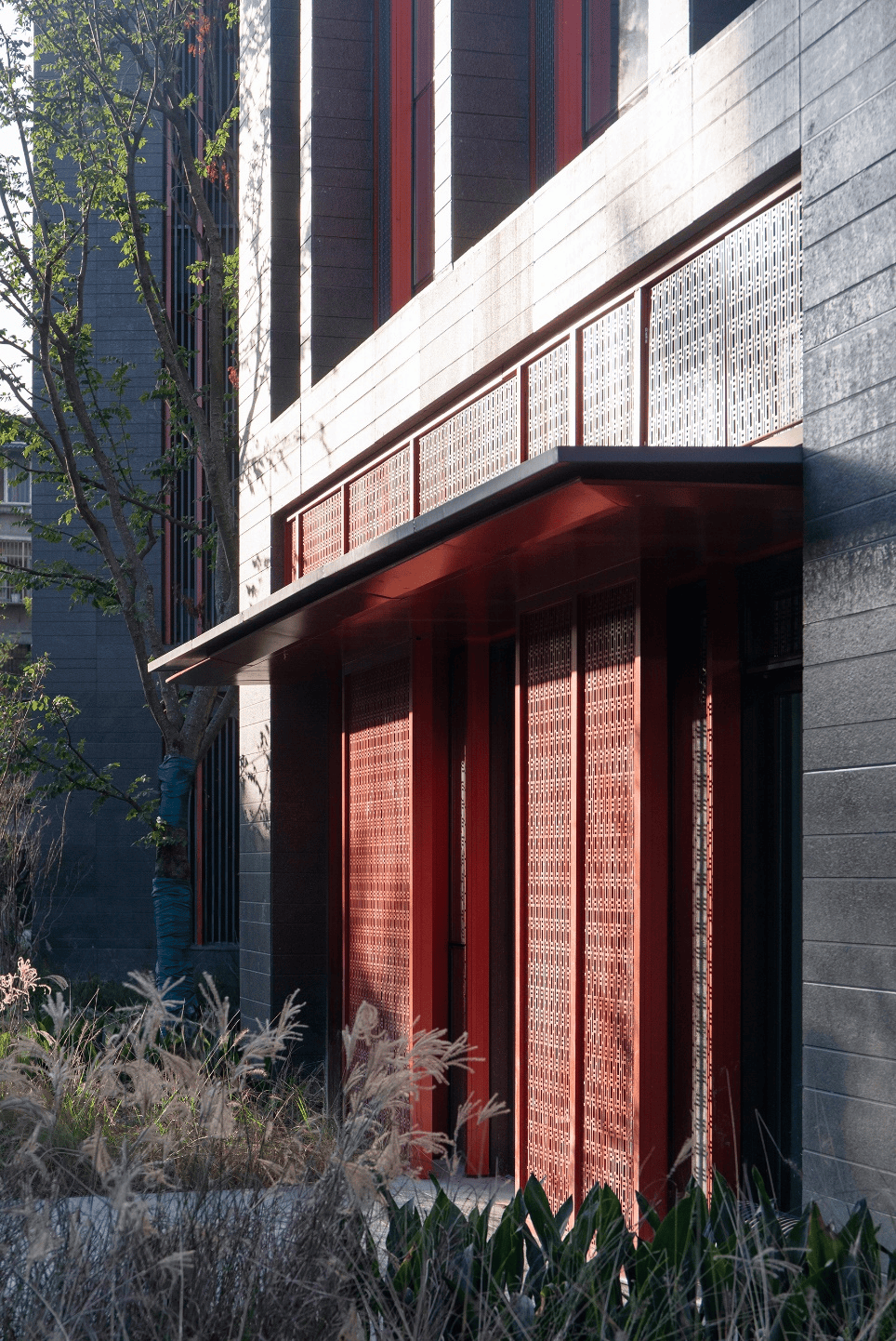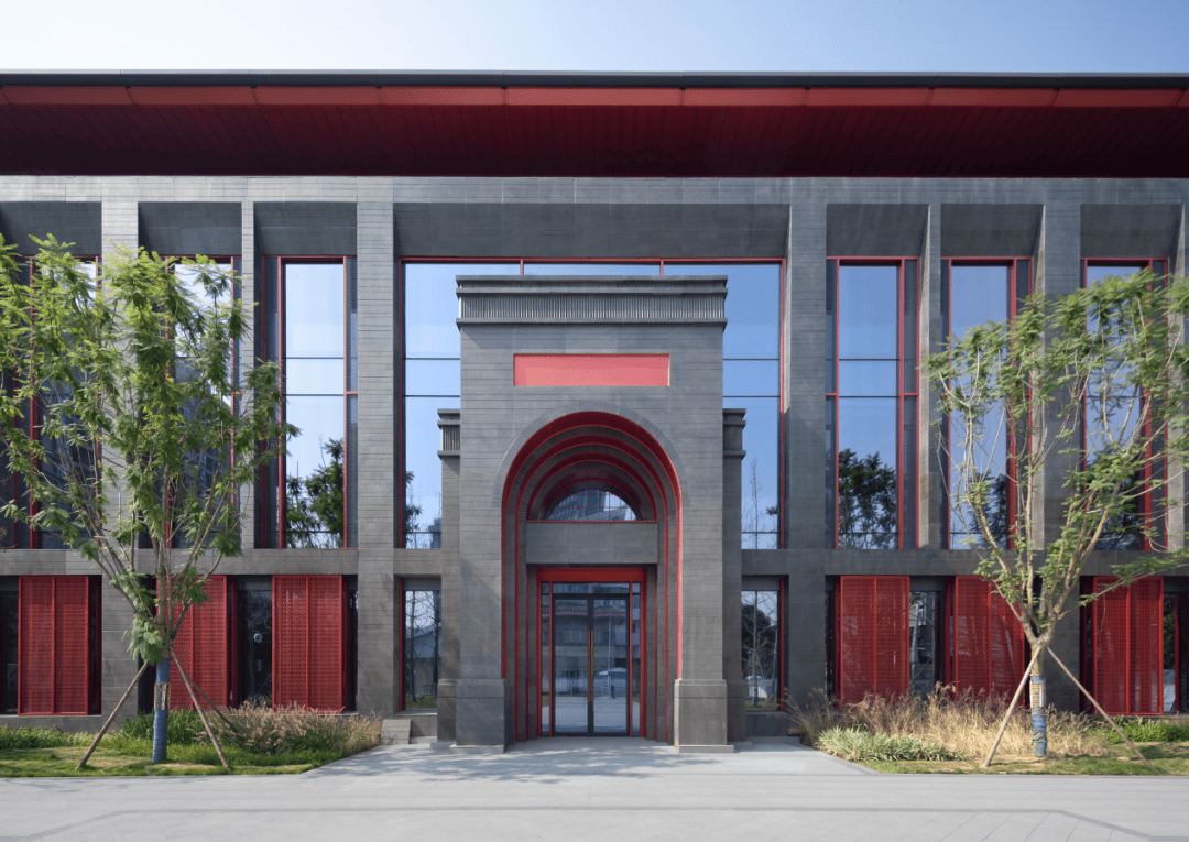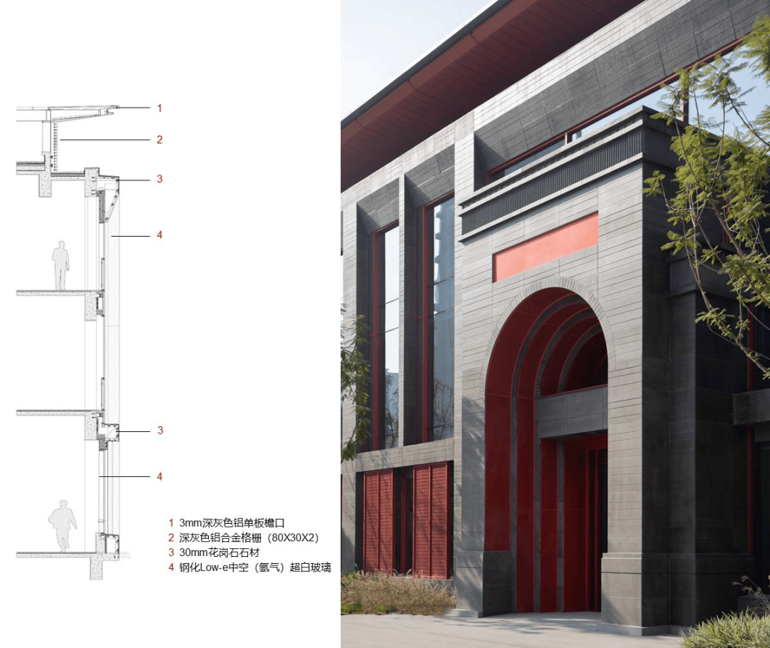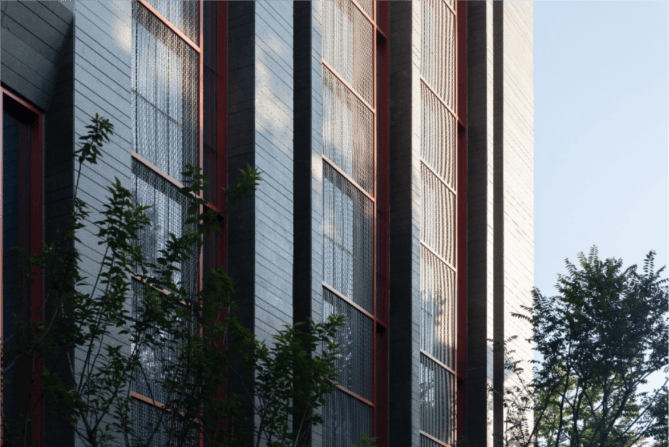 立面选用蓝灰色火烧面石材,通过宽窄拉槽,应答华西老建筑的砖砌肌理;450mm宽的内平开窗隐于红灰二色传统纹样的镂刻铝板背后,呼应了华西特色的门窗细部,又巧妙平衡通风功能与美学完整。