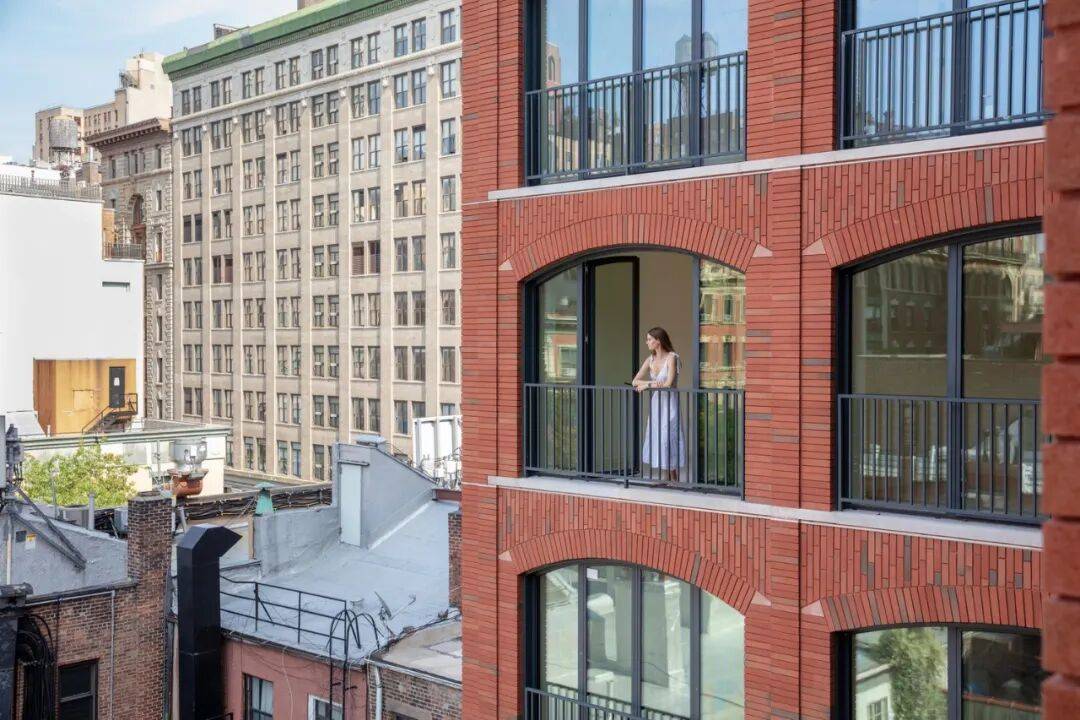 退台设计的巧思:上层逐渐退台形成露台,既满足纽约市日照法规要求,又为住户提供私密户外空间,增强居住舒适度。