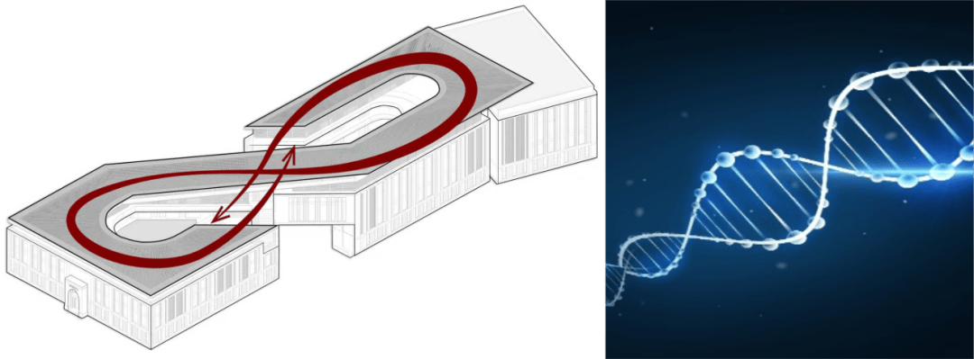 “∞”形空间理念:以正无穷大符号为灵感,将建筑分为东西两个中庭,一虚一实,形成虚实交替、交融创新的空间结构。东中庭以玻璃采光顶引入自然光,削弱地下空间感;西中庭以阶梯式退台向天空开敞,促进科研人员与自然的互动。