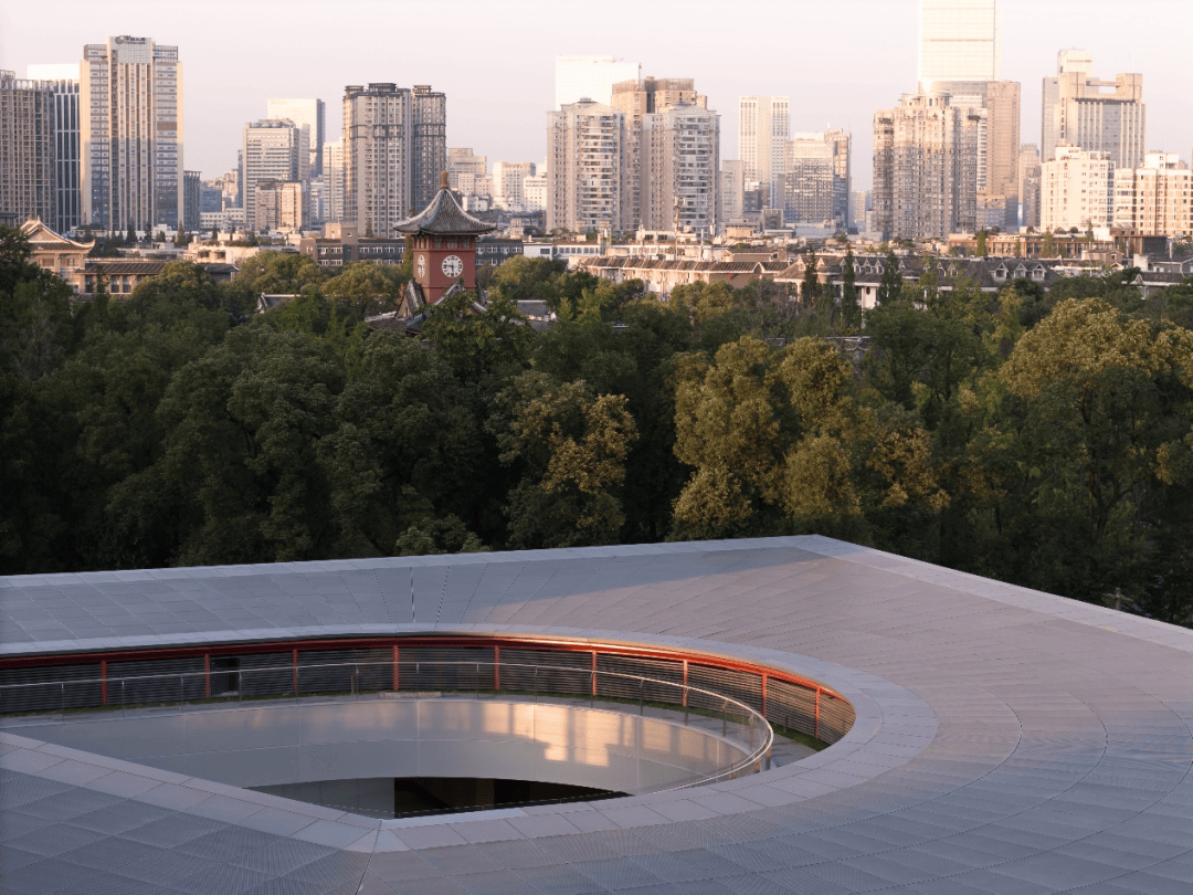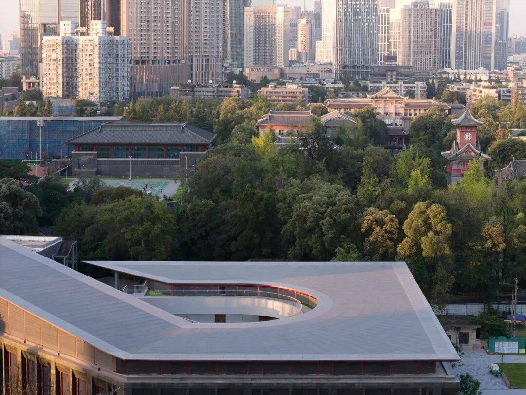 自屋顶俯瞰,建筑以相近的材质语汇及立面语法融入校园,百年风貌的典雅独特得以延续,现代科研的简约气质同时彰显——四川大学前沿医学研究中心研究的设计,尝试在复杂问题中做有限求解,追寻历史与未来的相融,为历史校园探索兼顾科技创新与文化传承的当代解法。我们希望,它将为城市呈现一座传承百年华西人文历史、展现科研探索与时代精神的汇聚之处。