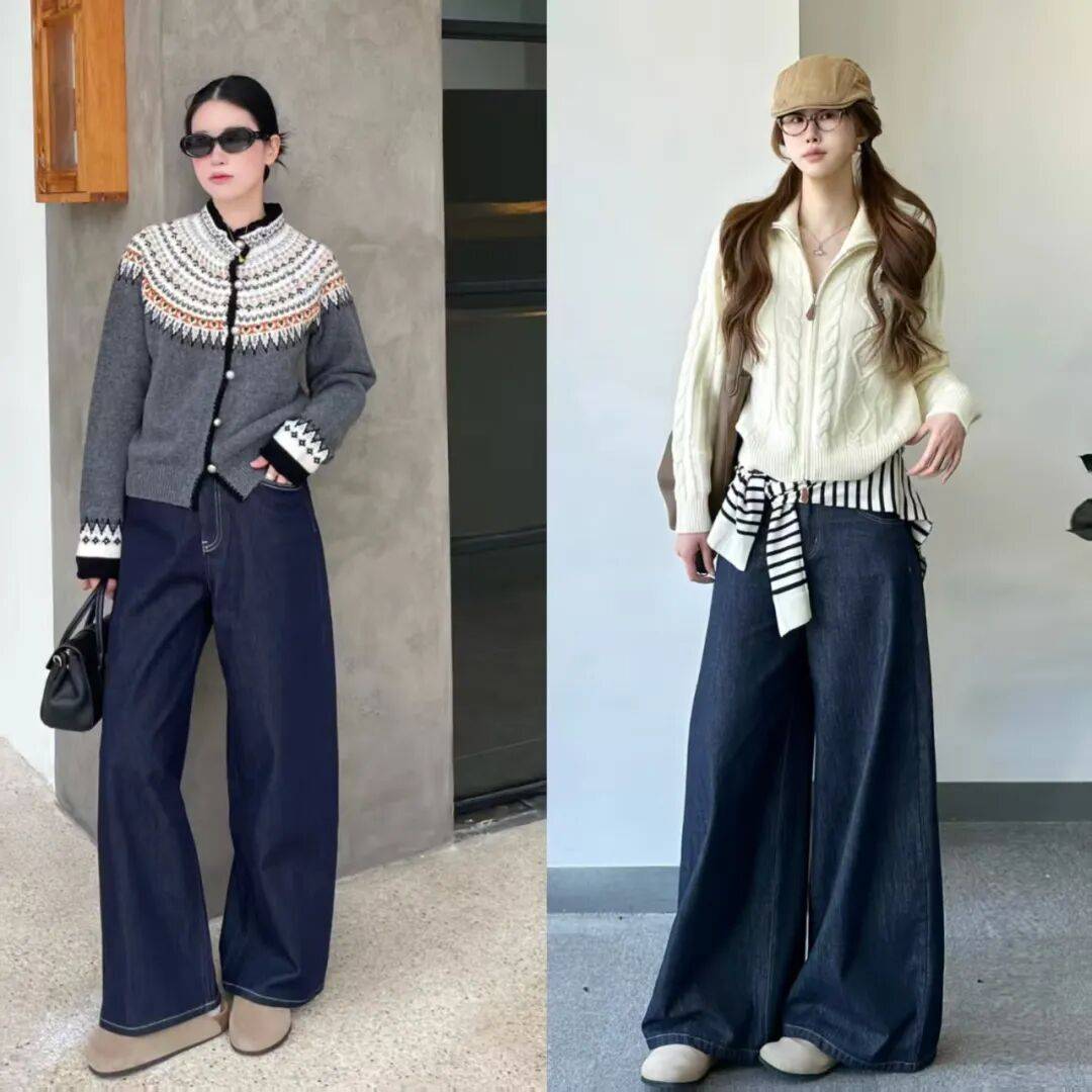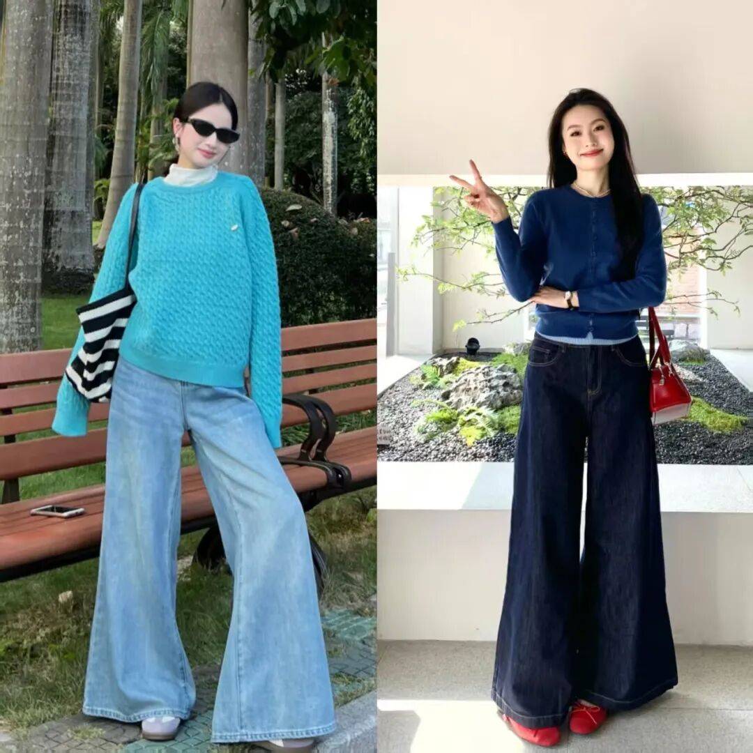 基础色毛衣+牛仔阔腿裤:黑白灰毛衣搭配蓝色牛仔裤,低调高级,适合通勤或日常出行。