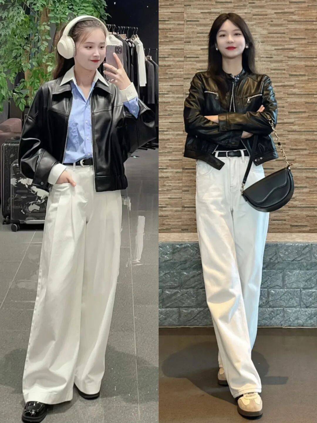 黑色皮衣与白色阔腿裤的搭配,展现出一种刚柔并济的美感。黑色给人冷峻的酷感,而白色则带来清新温柔的气质,形成鲜明对比,吸引眼球。棕色麂皮夹克与白裤子的组合同样火爆,叠穿白色打底衫和灰色针织开衫,更加丰富层次。