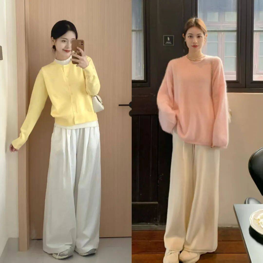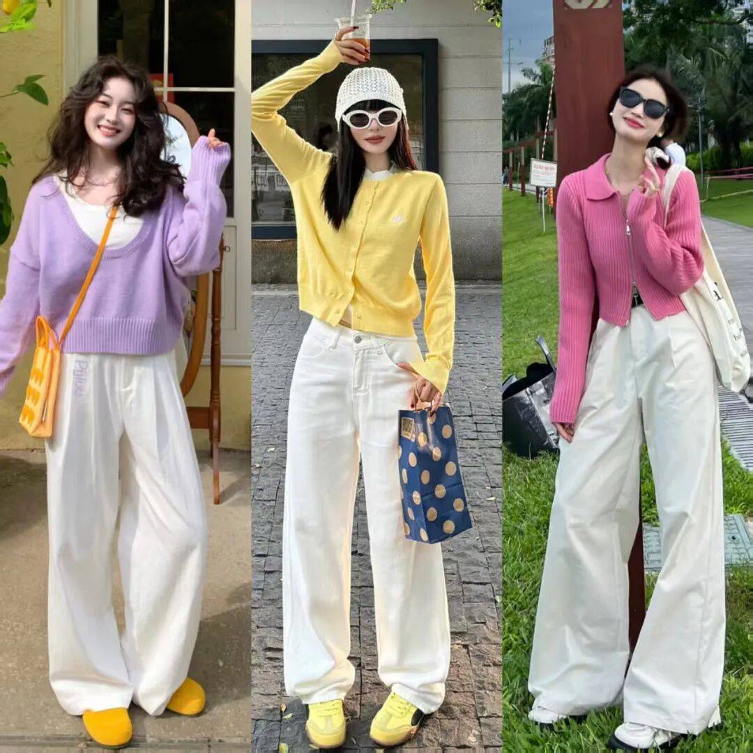 浅色系毛衣+白色阔腿裤:紫色、粉色、黄色毛衣搭配白色阔腿裤,清新温柔,适合春游或约会。