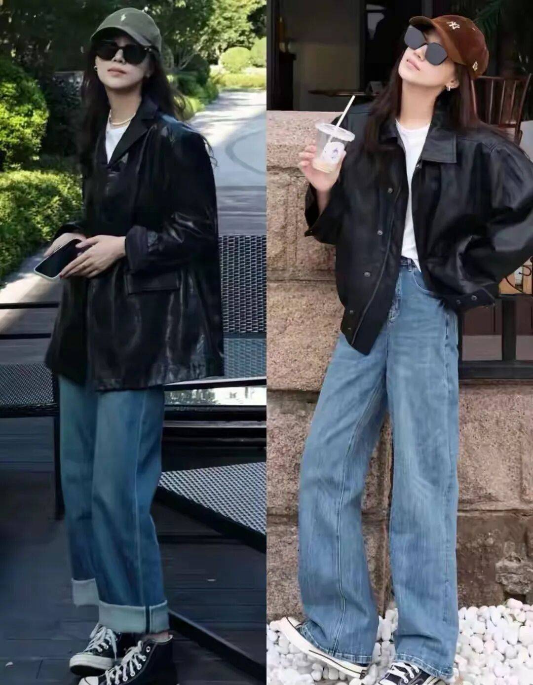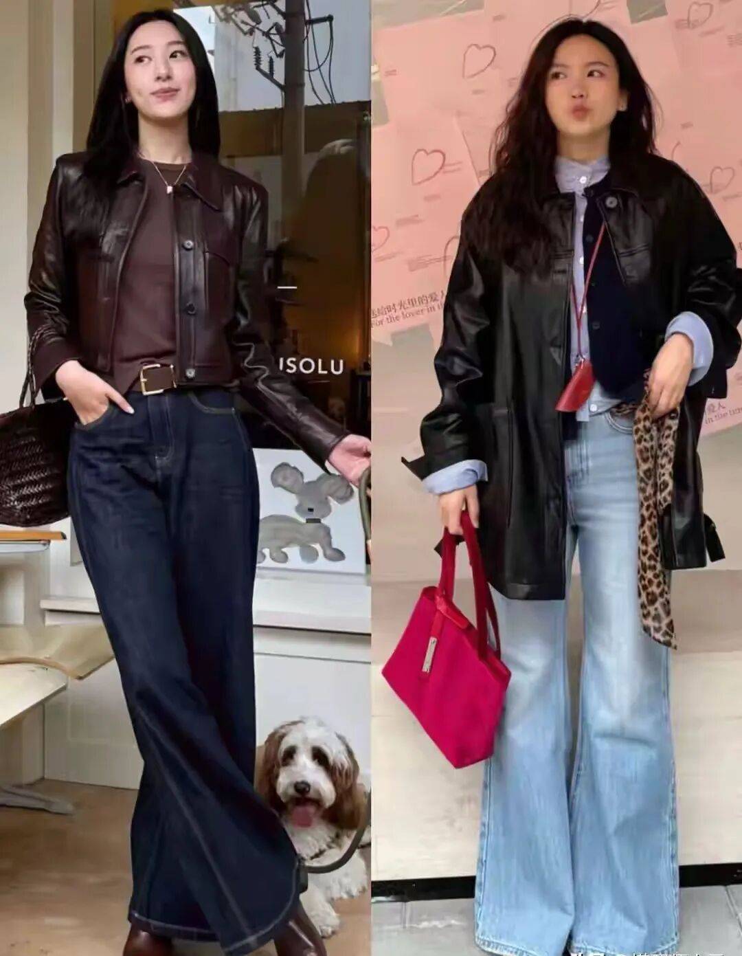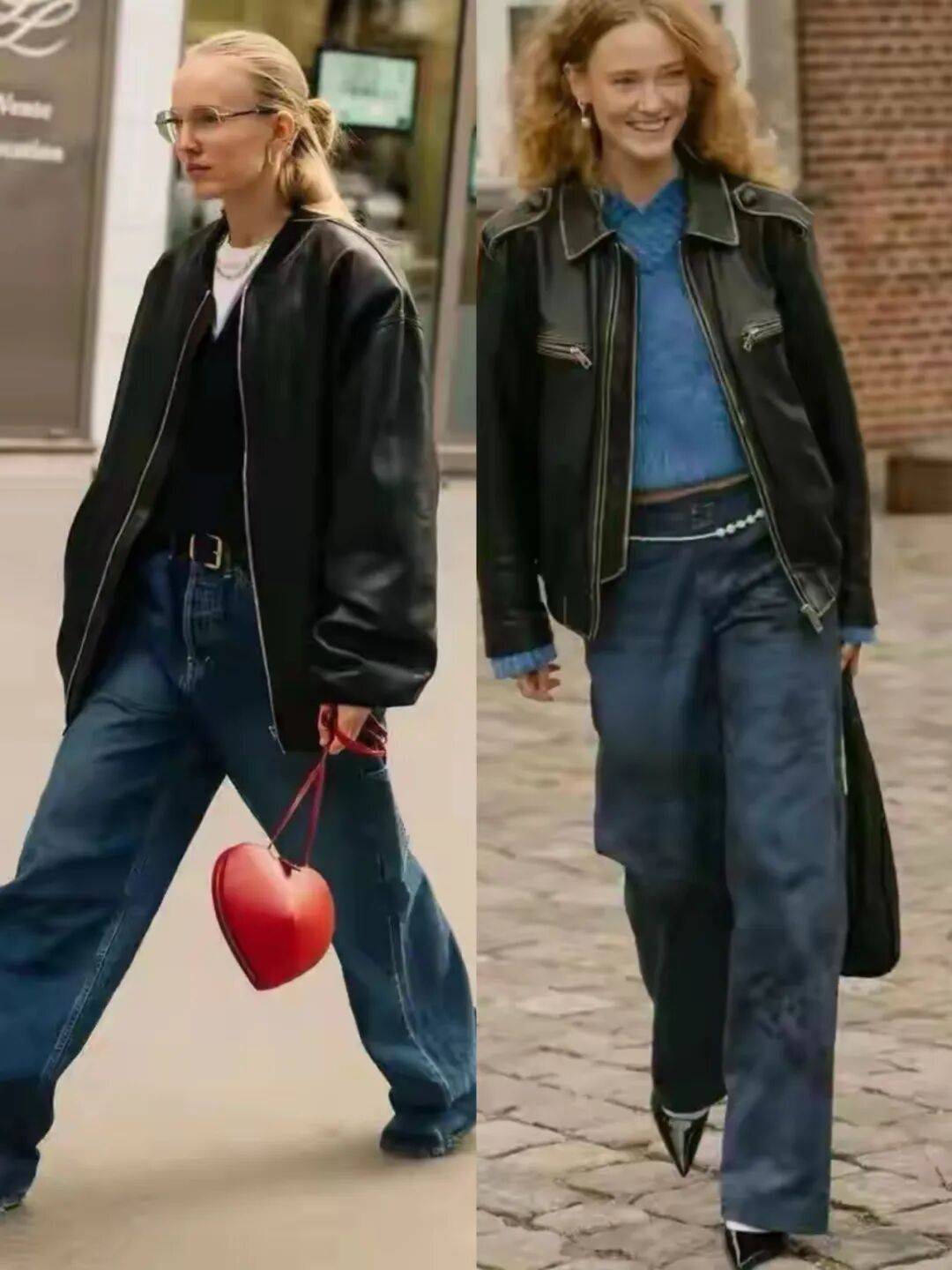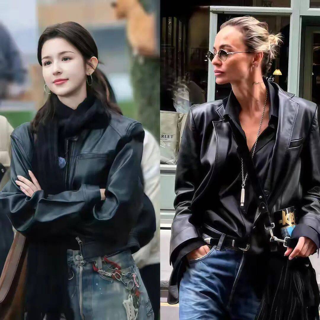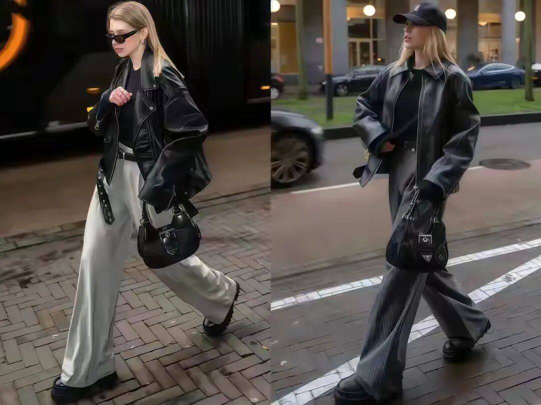 最经典的组合是黑色皮衣配蓝色牛仔阔腿裤,低调却高级,而且这个组合特别适合加入一件红色的小配饰来点缀,比如一顶红色的针织帽子,或者一个红色的包包,都能让你的造型瞬间亮起来。