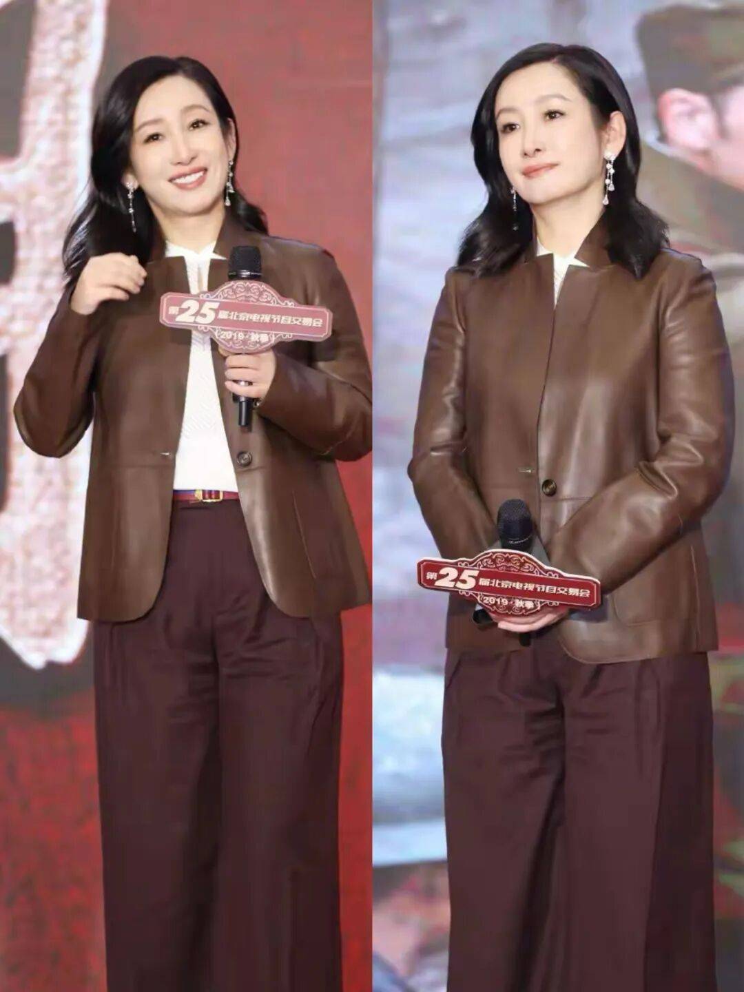 同色系搭配:棕色皮衣+黑色阔腿裤,腰间系苹果绿毛衣,打破单调,增添轻松氛围。