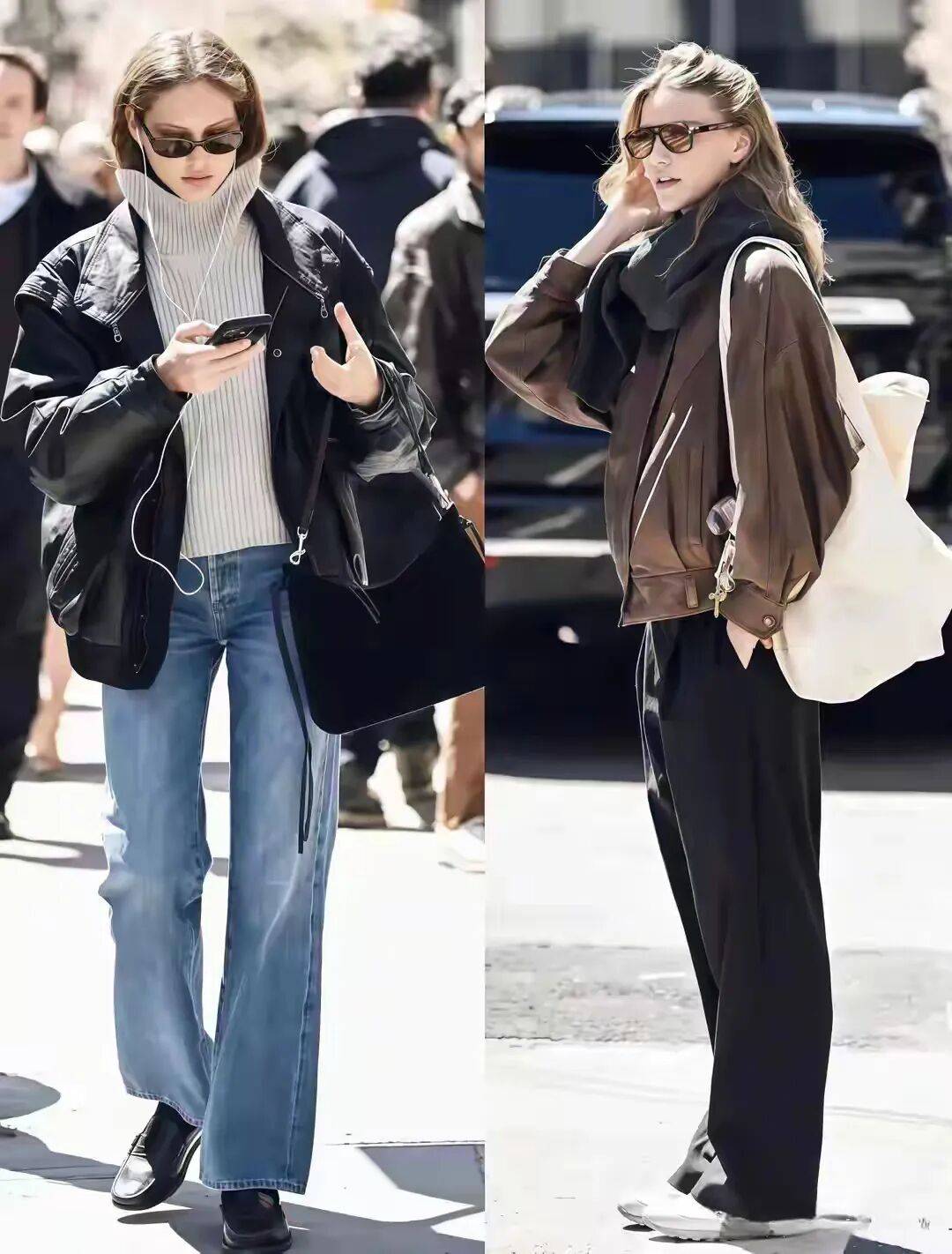 撞色搭配:黑色皮衣+白色阔腿裤,冷峻与清新对比,吸引眼球;棕色麂皮夹克+白裤子,叠穿白色打底衫与灰色针织开衫,丰富层次。