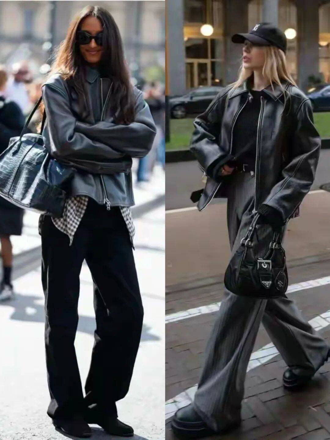 皮衣配牛仔阔腿裤,是懒人时髦精的终极答案。