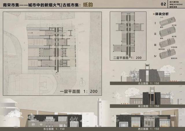 本次设计为以南宋时期在杭州盛行的古纸为题的古法造纸市集。在建筑的生成上,首先将古法造纸按步骤分为4个体块;其次,在场地的东侧置入主体块串联起4个故事,同时也在西侧退让出开放性的空间吸引人流;最后,在偏心轴线的两侧,升起斜向的主承重墙穿出屋顶,加强与望仙阁的呼应。