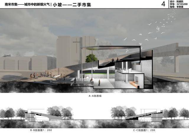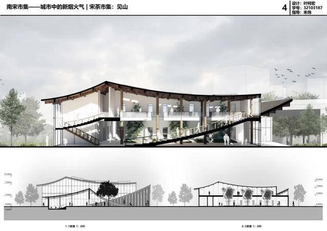 在场地置入三个并置错动的体块,建筑呈山势跌落至地面密切联系南宋御街步行街道的群体,跌落点面朝鼓楼,同时吸纳人流。宋代坡屋顶意向提取,屋顶内嵌入体块,作交通空间,实现在行走过程中感知建筑尺度。最后对坡屋顶作挖洞处理,既是为植物作出退让,又使植物成为建筑的一部分。上人的坡屋顶四周的市集空间,坡屋顶高度变化给不同年龄段的人群提供不一样的空间感受,檐下空间有大有小,有宽有窄,能通过流线变化相互交织。在立面处理上,玻璃龙骨支撑玻璃幕墙外能实现宽阔的景观面,看室外摊位以及人来人往的南宋御街,实现和鼓楼的对望关系;通过半遮掩的宋式屏扇立面形式,实现视线的虚实交替。