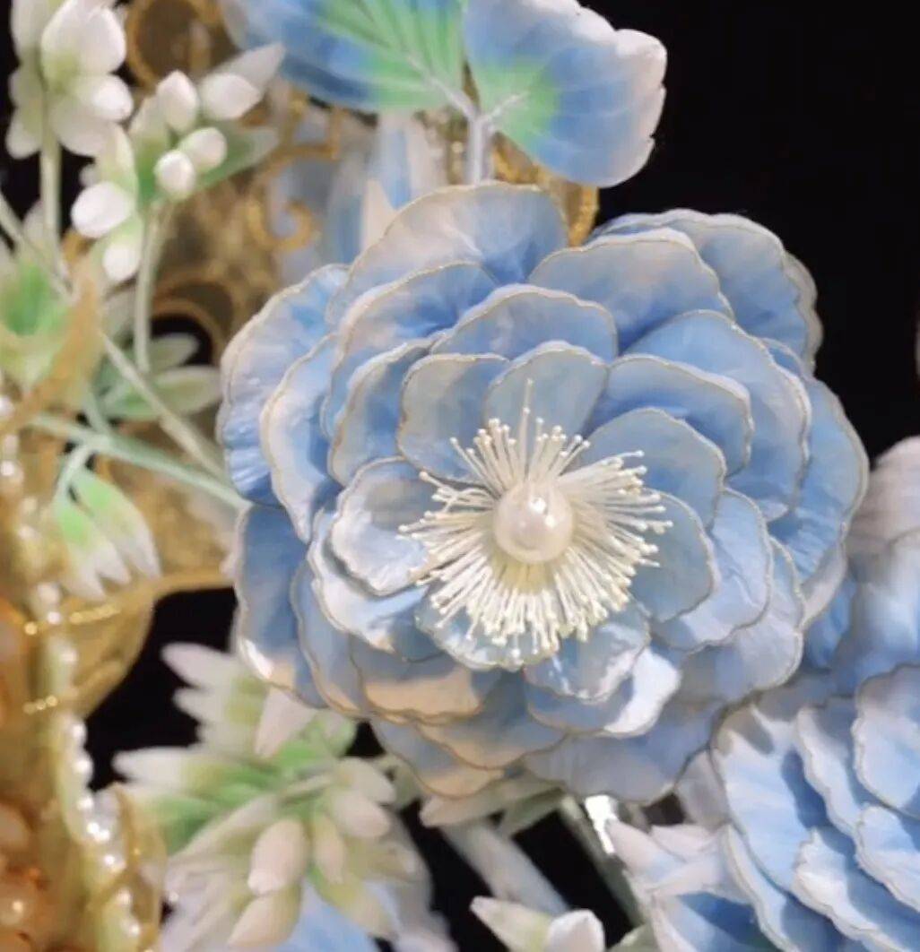 技艺背景:以蚕丝和铜丝拟花,表面绒毛赋予色彩层次感,古时多为头饰。