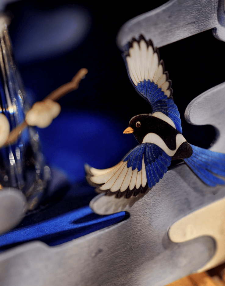 “细木镶嵌”,需要将多达130多种颜色,以及各种纹理的微小木材用作画的方式进行镶嵌,并且要保证最终出来的作品确实细腻平滑得如一副画作。