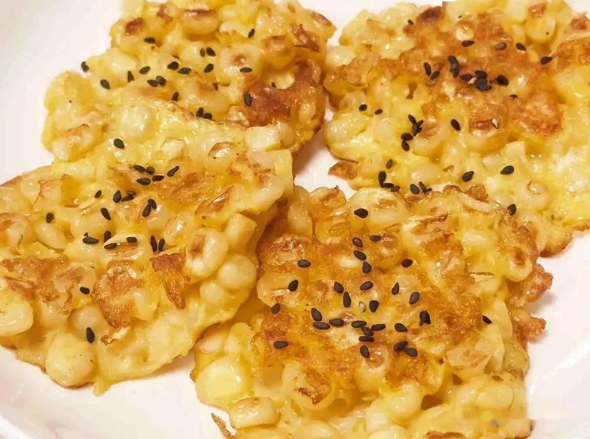做法:甜玉米粒加糯米粉、牛奶摊成薄饼煎至金黄,撒芝麻。
