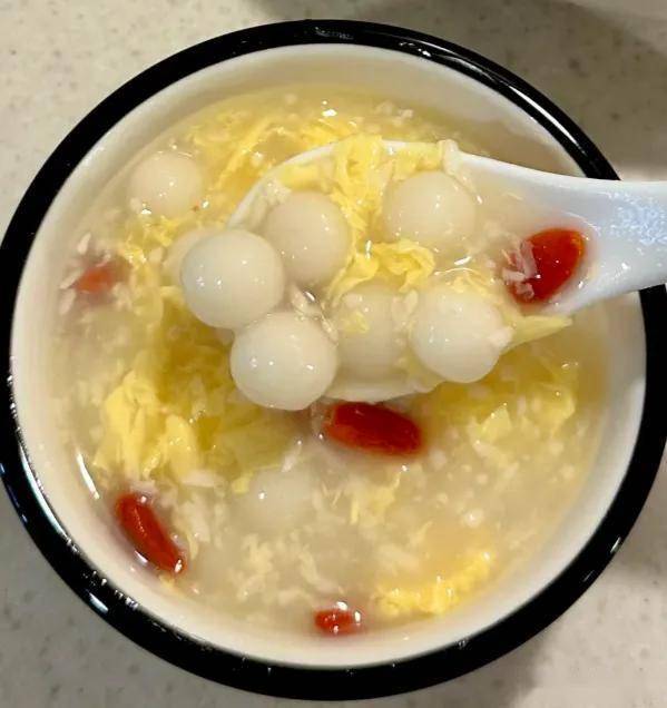 做法:糯米圆子煮至浮起,加入酒酿、枸杞、红枣,淋蛋液。