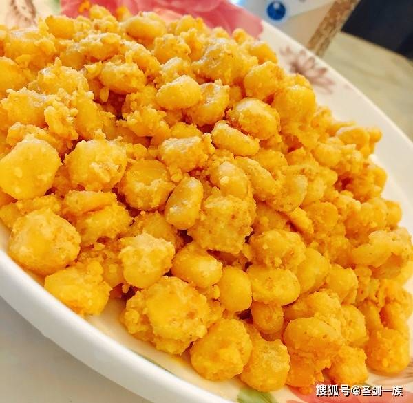 4、锅中留少许底油,倒入咸蛋黄泥,开小火慢慢翻炒,炒至蛋黄泥翻沙、冒出密集的小泡泡。倒入炸好的玉米粒,加入少许白糖,快速翻炒均匀,让蛋黄沙均匀地包裹住玉米粒,最后撒上葱花即可出锅。