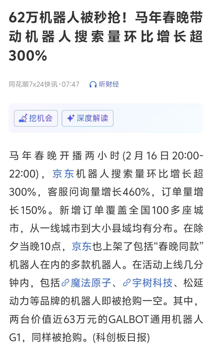春晚后京东机器人搜索量环比增长300%,部分企业合作权益报价达6000万至1亿元。