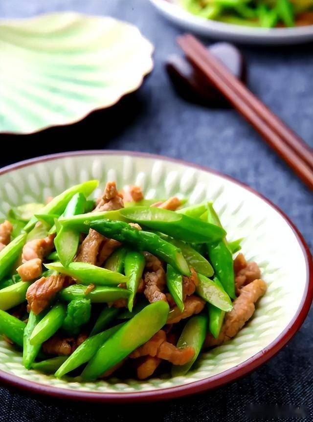 芦笋200克、猪里脊肉150克、大蒜2瓣、生姜1块、盐1克、生抽1勺、料酒1勺、淀粉1勺、食用油适量