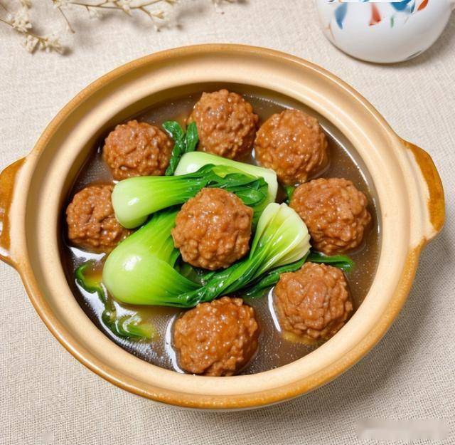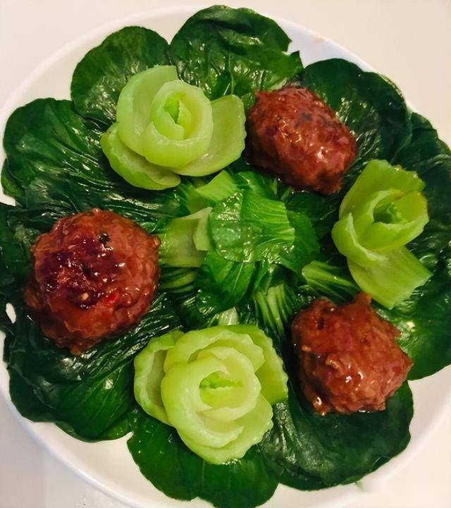 6. 炖煮好的狮子头捞出,放在摆好的油菜上。