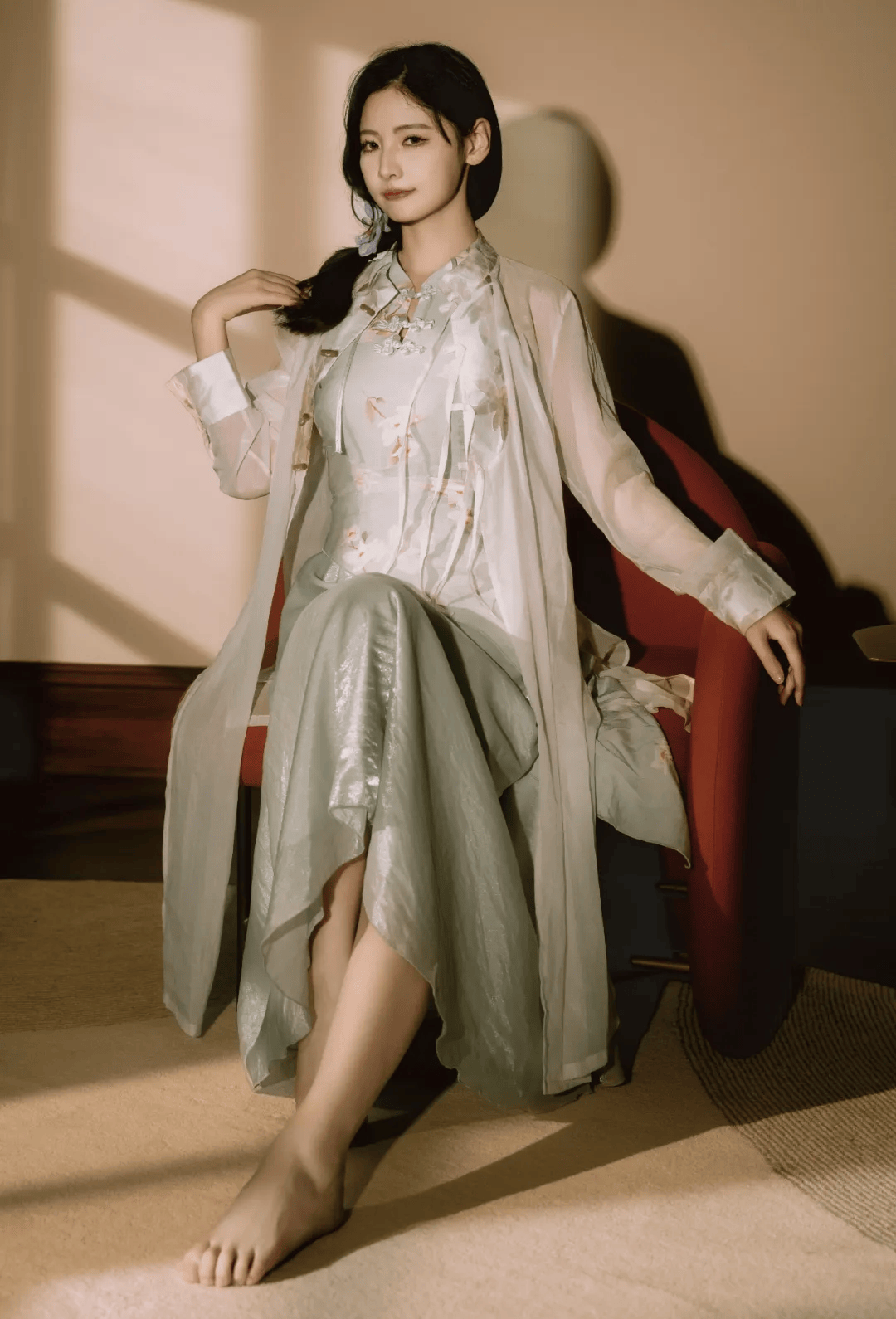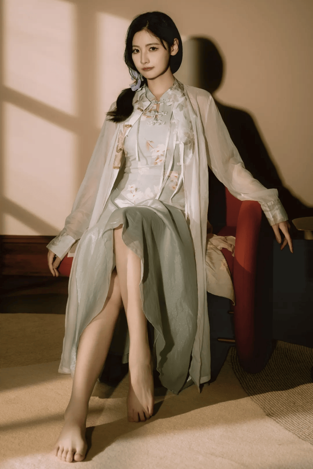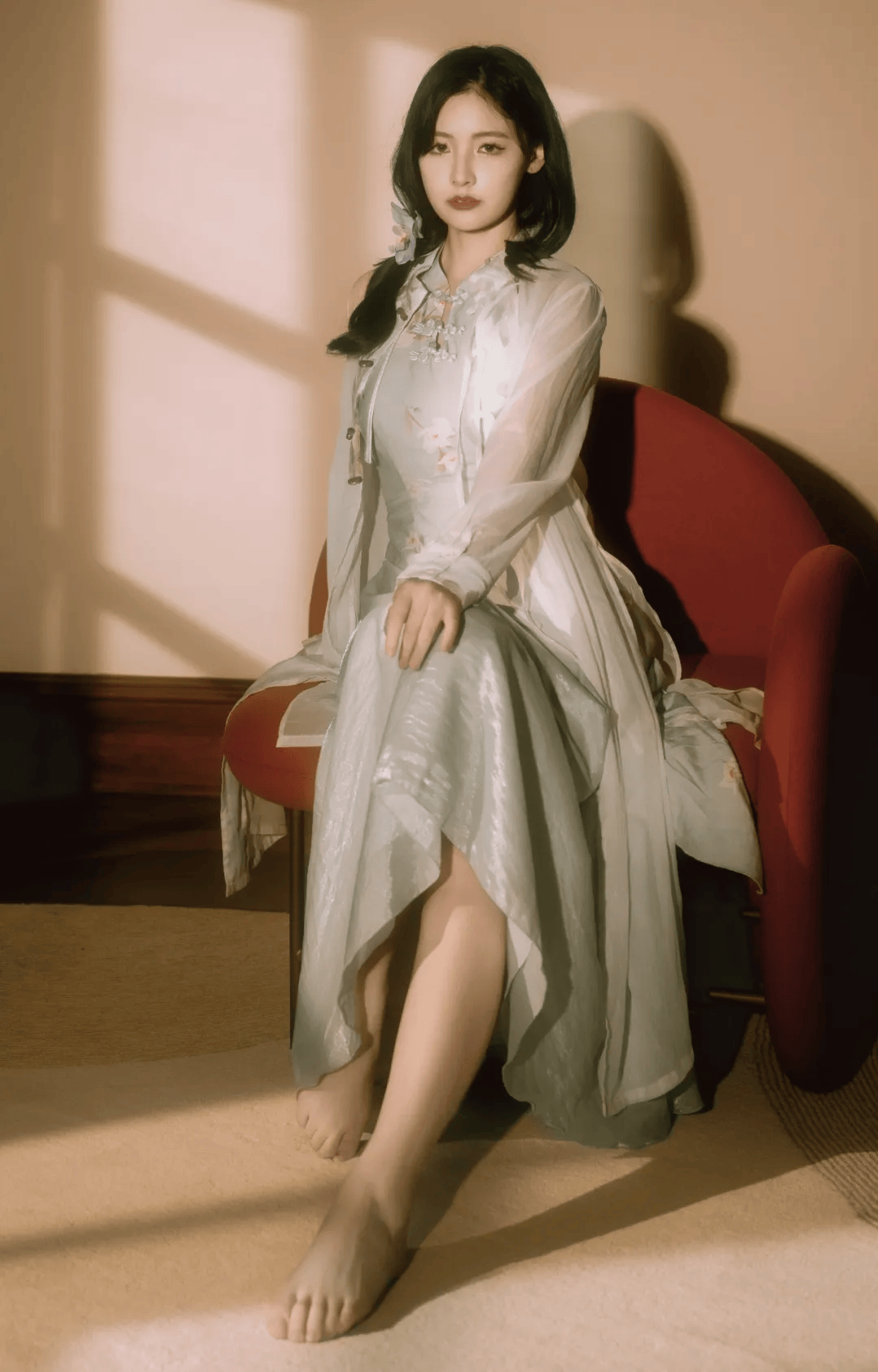 赵粤穿着鎏金刺绣旗袍斜倚朱栏,团扇轻摇间展现出江南水墨画般的清冷感与灼灼桃花般的热情,矛盾的美学令人惊艳。作为SNH48的舞担,她在舞台上气场全开,从女团成员到帅气学姐,利落短发与旗袍产生奇妙化学反应。竹林写真中,真丝吊带裙勾勒出蝴蝶骨振翅的弧度,宛如月下练剑的侠女。她从第一次公演的紧张同手同脚到如今的舞台王者,不断打破柔美框架,私底下却是个会给舞鞋取名的萌妹。她刚柔并济的特质让每次亮相都令人期待。